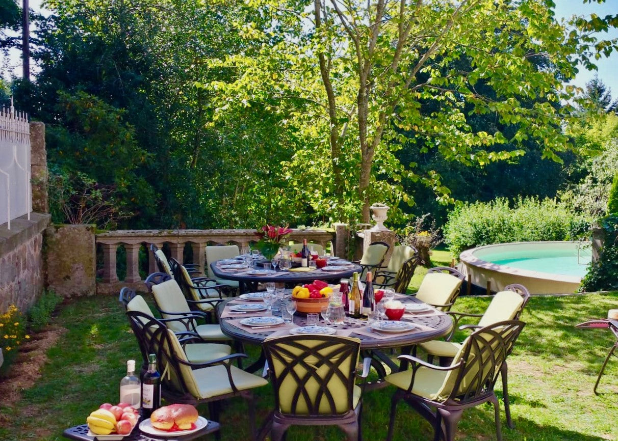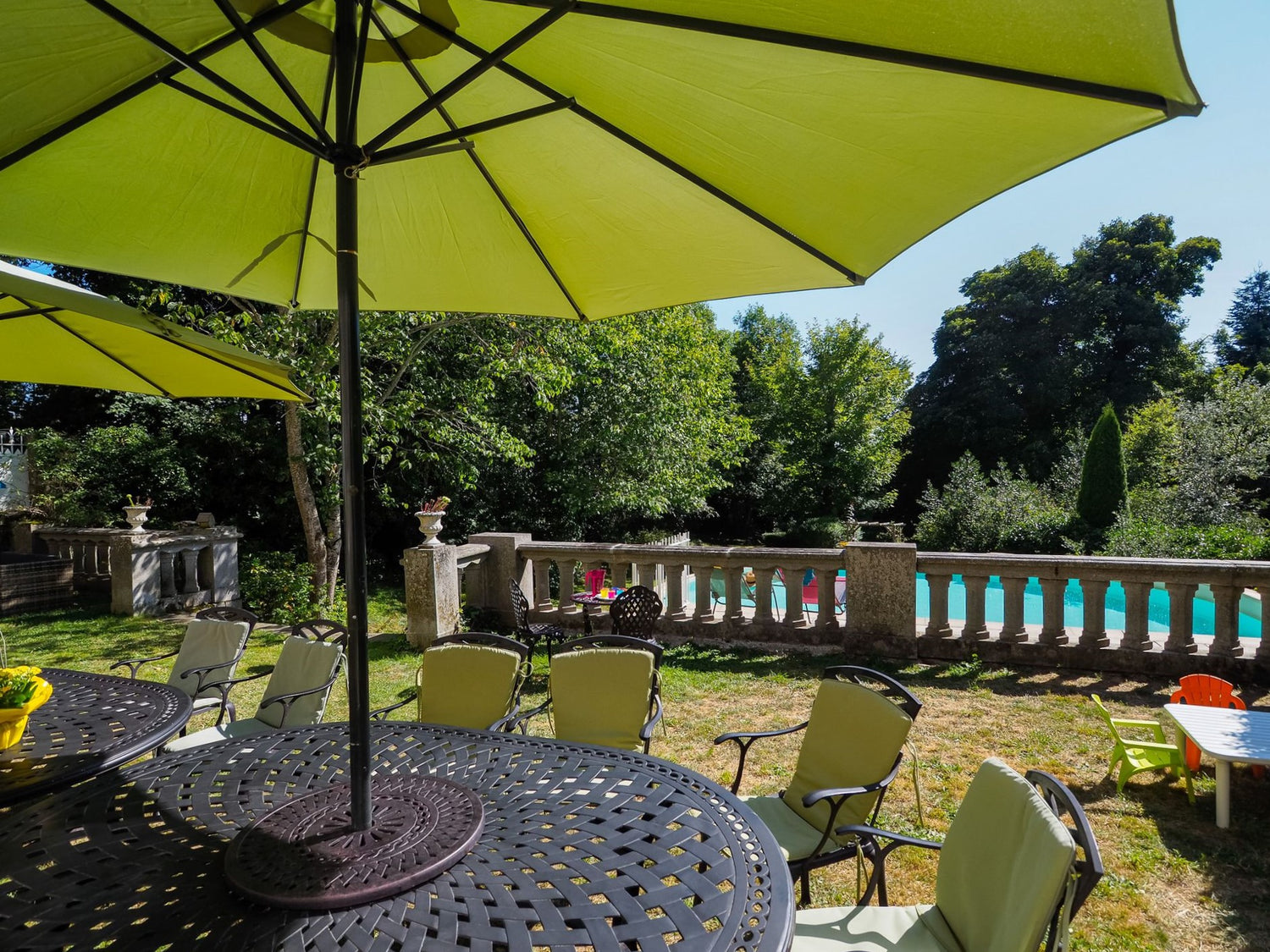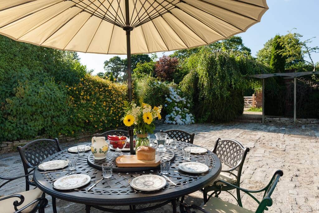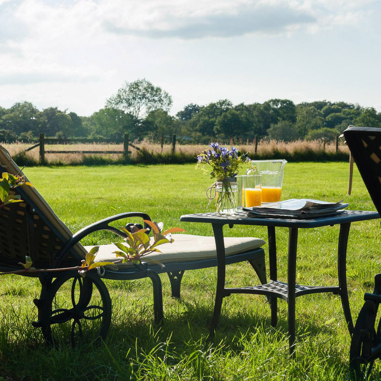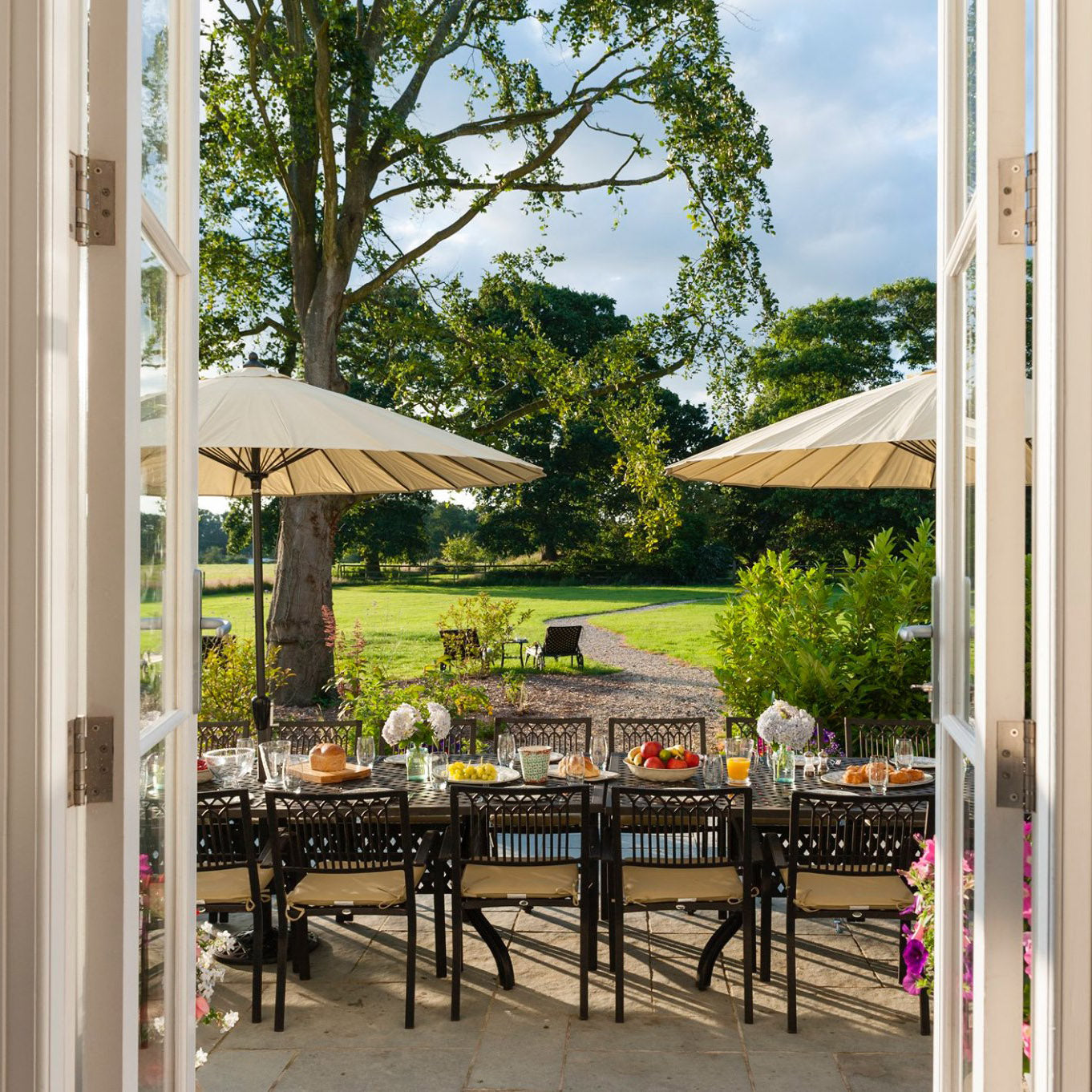 Produkte, die Sie hier finden: die June 6 seater mit April-Stühlen, Terrakotta-Kissen und Sonnenschirmen, und die Stella Liegestühle in antiker Bronze.