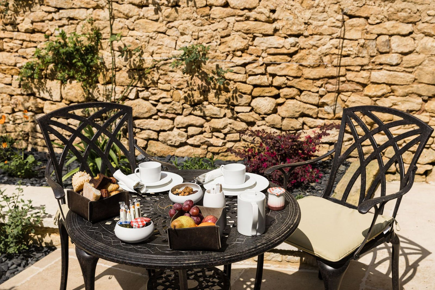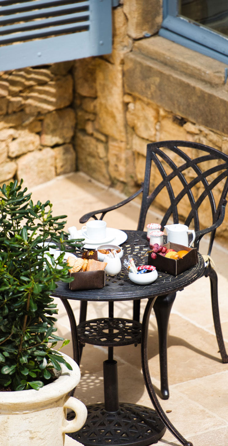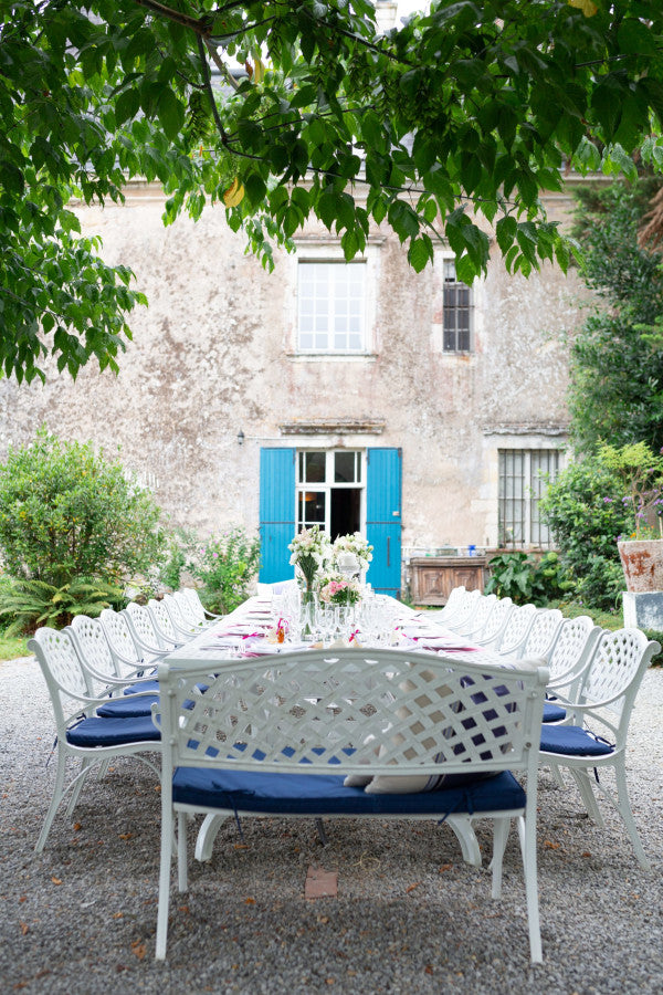 Produkte, die Sie hier finden: die Tische June, Alice und Anna mit den stapelbaren Jane Stühlen in Antik Bronze sowie die Bank Rose mit dem Beistelltisch Sandra