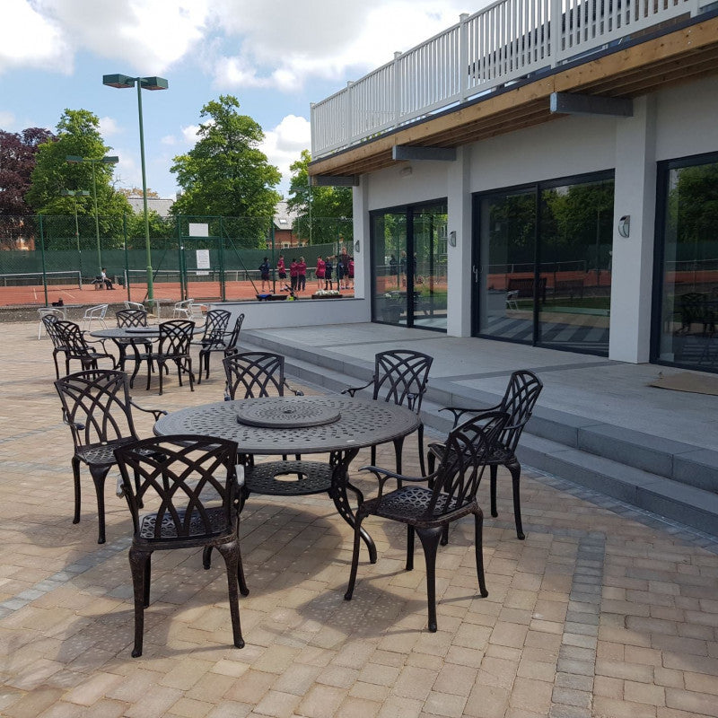 Produkte, die Sie hier finden: die Tische Alice und Anna mit April Stühlen in Antik Bronze.