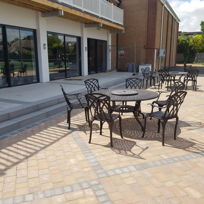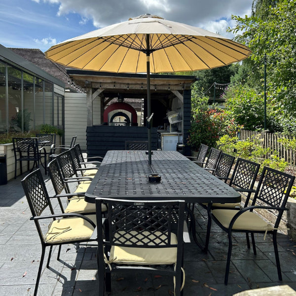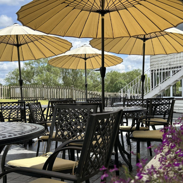 Produkte, die Sie hier finden: die Tische Alice und Isabelle mit Sonnenschirmen und den stapelbaren Jane Stühlen in Antik Bronze mit passenden Sitzkissen