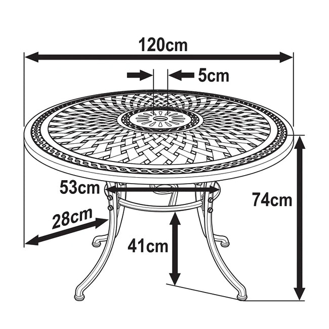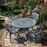 Der Alice Tisch mit vier Stühlen gehört zu unseren beliebtesten Gartenmöbel-Sets. Der wunderschön aus Aluminiumguss gefertigte Tisch besticht mit seiner gitterförmigen Tischplatte und dem geflochtenen Randdesign während die Lackierung in zeitlosem Schiefergrau sich wunderbar in jeden Gartenstil einfügt, egal ob modern oder traditionell. Perfekt für einen Brunch im Freien oder einen entspannten Grillnachmittag, lädt die runde Tischform zum geselligen Beisammensein ein.