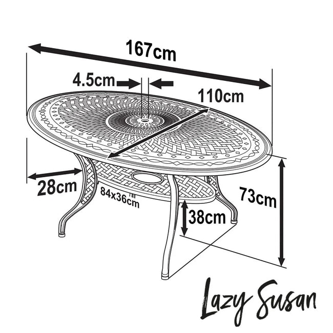 Das Charlotte Gartenmöbel-Set für sechs Personen ist eine platzsparende und zugleich komfortable Lösung für stilvolles Essen im Freien. Mit seiner elliptischen Form und den eleganten Metallverzierungen, die von einem schlichten Margaritenmotiv in der Mitte ausgehen, wird dieser eindrucksvolle Tisch garantiert zum Blickfang in jedem Außenbereich. Gefertigt aus hochwertigem Aluminiumguss und in frischem Weiß lackiert, passt der ovale Gartentisch perfekt zu modernen wie auch zu klassischen Gärten.