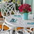 Der runde Hannah Gartentisch in elegantem Weiß besticht durch ein geflochtenes Gittermuster und einen verspielten Rand mit floralem Design. Die kunstvolle Metallarbeit macht diesen Rundtisch zu einem echten Blickfang und zur idealen Wahl für kleine Gärten und Terrassen. Ob für ein romantisches Frühstück, Aperitifs im Freien oder ein entspanntes Mittagessen mit Freunden – der attraktive Hannah Tisch bietet Platz für jede Gelegenheit.