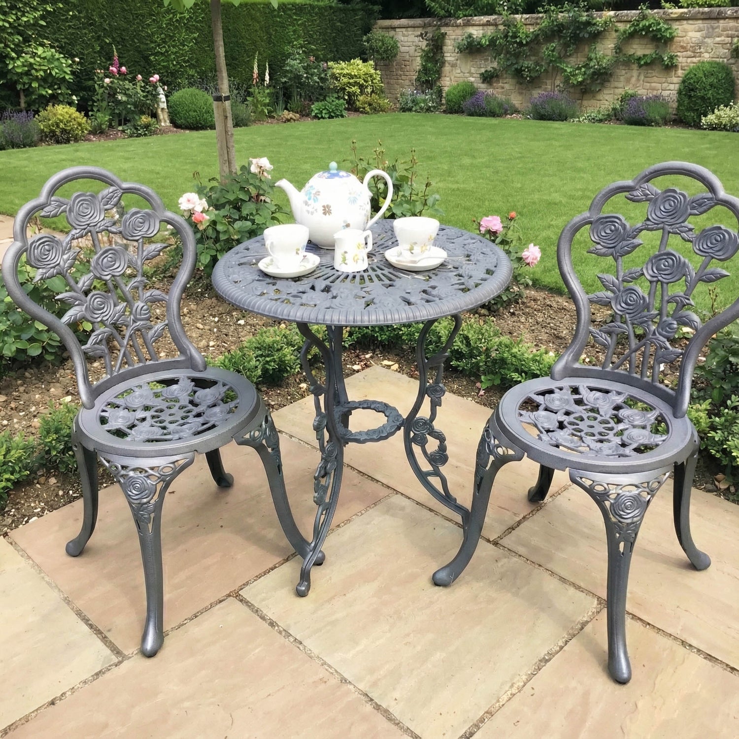 Das London Rose Set ist ein stilvolles Bistroset für zwei Personen mit einem ausgeprägten floralen Charakter. Die vielen kunstvollen Details, die runde Tischplatte mit ineinander verschlungenen Rosen und die aufwendig verzierten Bistrostühle machen dieses Set zu einem bezaubernden Blickfang. In einem zeitlosen Schiefergrau gehalten, lädt das London Rose Bistroset zu verträumten Momenten auf dem Balkon oder der Terasse ein.