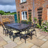 Der Madison Gartentisch in Antik Bronze ist ein imposanter, rechteckiger Tisch von 2,6 Metern Länge, der aufwendig aus pulverbeschichtetem Aluminium gefertigt ist. Die geräumige Tischplatte überzeugt durch Ihr geradliniges Gittermuster, das sowohl puristisch und modern als auch funktional ist. Dieses großzügige Set mit zehn bequemen Stühlen eignet sich perfekt für eine große Terrasse oder eine Rasenfläche und bietet reichlich Platz für gesellige Runden. Ideal für Zusammenkünfte mit Familie, Nachbarn und Freunden, aber auch beliebt bei gewerblichen Kunden, die nach beständigen Optionen für den Einsatz in Hotels und Restaurants suchen.
